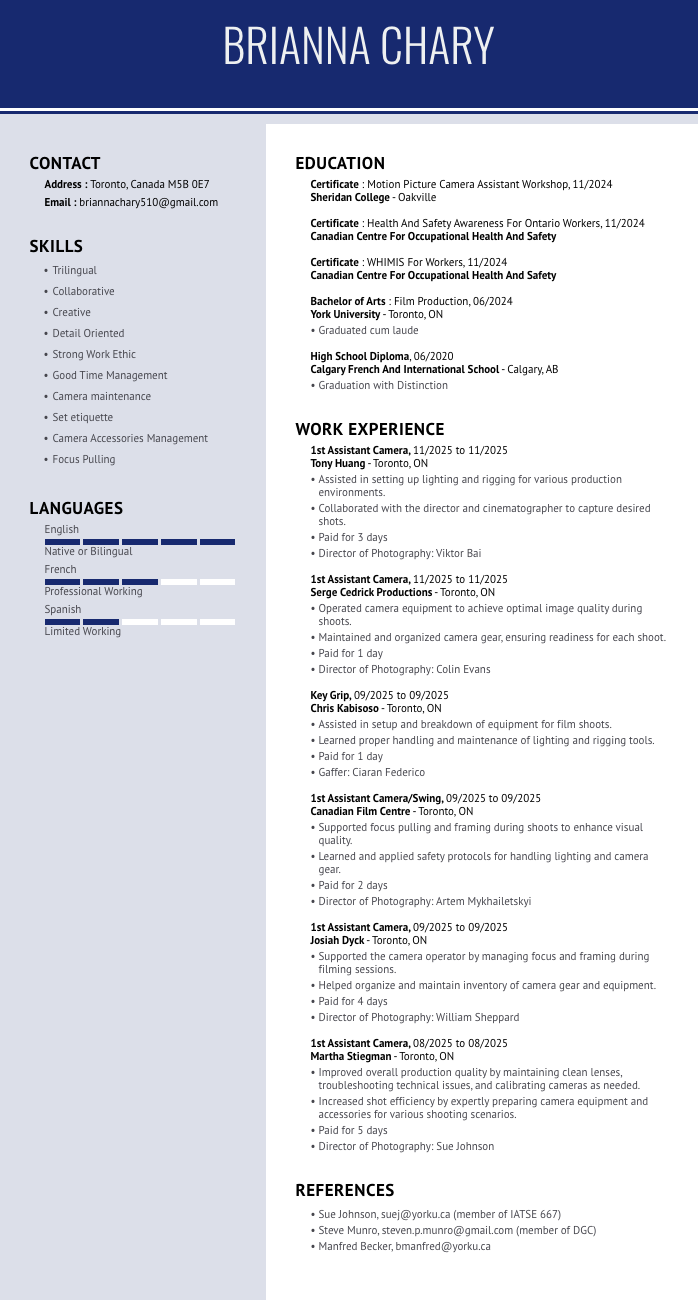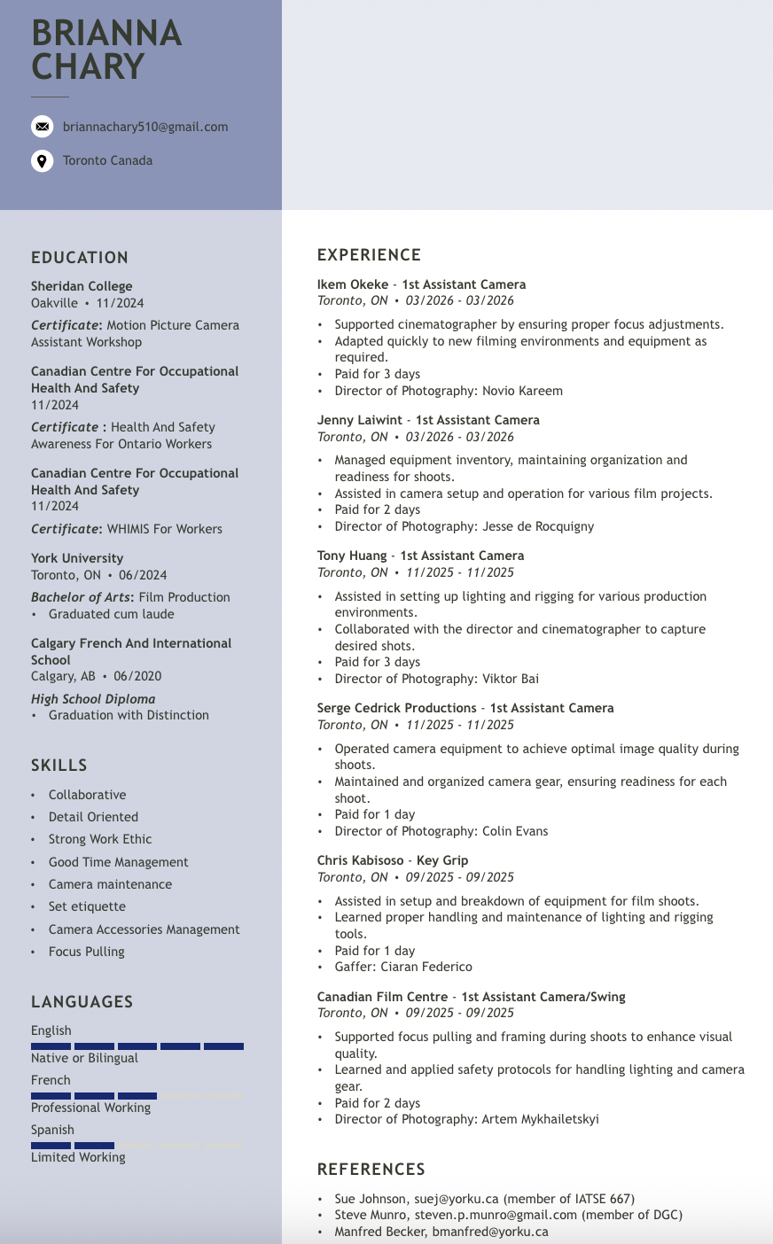 Dedicated to both, the technical and creative aspects of filmmaking, I have experience with industry-standard equipment and software, and bring a collaborative, detail-oriented approach to every production. I am currently building a portfolio of independent work and freelancing on narrative and commercial projects across Canada.